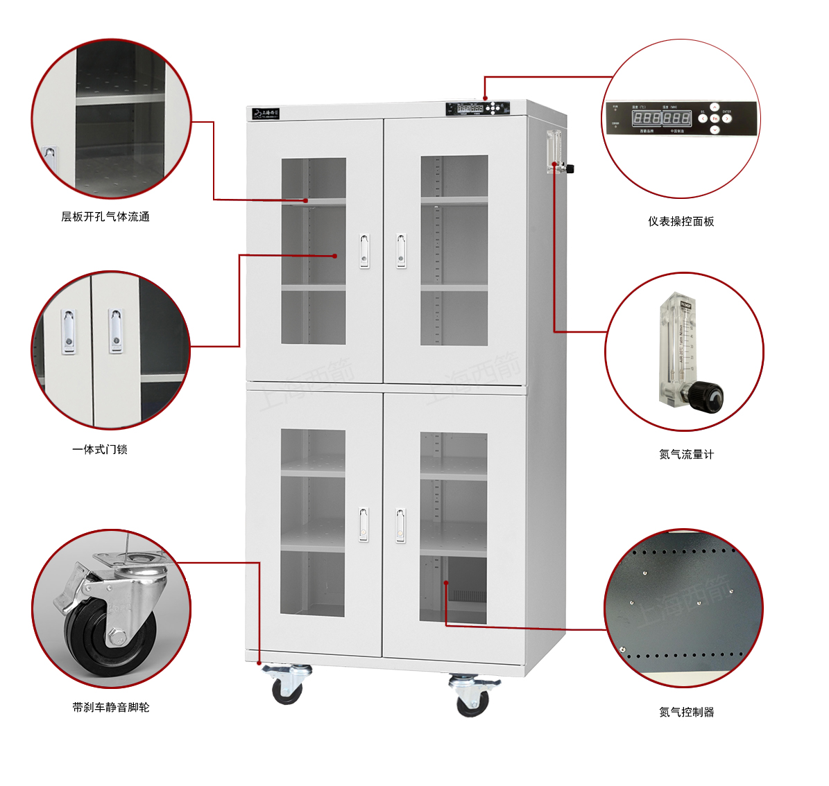 7、流量計(jì)采用防爆流量計(jì),濕度1~60%RH可設(shè)定,濕度到達(dá)設(shè)定值時(shí),系統(tǒng)自動(dòng)切斷氮?dú)?,反之自?dòng)打開氮?dú)狻k姶砰y為日本SMC品牌,氮?dú)夥至飨到y(tǒng),確保箱內(nèi)氮?dú)夥植季鶆颍?br>8、全系氮?dú)夤裰С侄ㄖ?,可選裝手機(jī)智能預(yù)警模塊,可選裝計(jì)算機(jī)連接模塊。